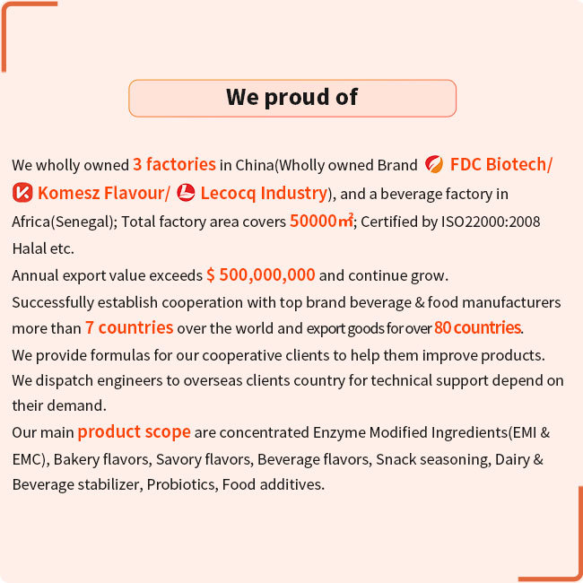 Chúng tôi cung cấp hơn 4000 loại hương vị thực phẩm, chất ổn định cho sữa và nước trái cây, Probiotics, xi-rô tập trung và cải thiện dinh dưỡng sản phẩm.